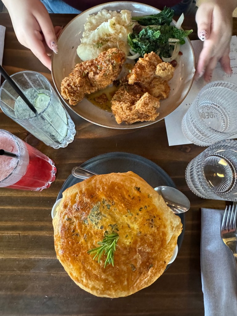 now for the real stars: honey fried chicken and chicken pot pie. i have never in my life had a chicken pot pie because it seemed like it would be too creamy for me but i kept watching videos of people making and eating some and oh my god every video i watched they looked so damn good. she was made with carrots, potatoes, celery, onions, green peas, herbs, roux, cream, and a phyllo dough crust. i guess that phyllo dough is also what they use to make baklava and other flakey pastries and let me just say something… that crust was the star of the whole show. i wish i could have the pot pie exactly how it was plus a side of the bread by itself. also the pot pie was FAT. miss amy got the honey fried chicken and i was so happy because that was my other contender of the day.. but she lost. i was so lost in the sauce with my pot pie that i didn’t even ask amy for a bite. live and you learn baby. you know what though, i would’ve hated the mashed potatoes and gotten double kale.