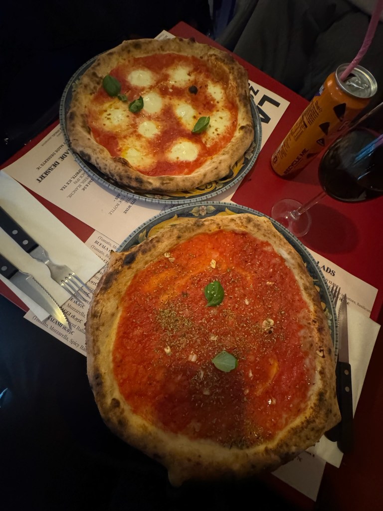 we got in quickly, i got the house red, azul got a fanta. she got the margherita, i got the marinara. we’re simple, hungry girls really. everything about it was so good just our table was to small. also am i the only person embarassed to eat pizza in europe because they don’t slice it but you get a knife and fork and everything i know goes out of the window.