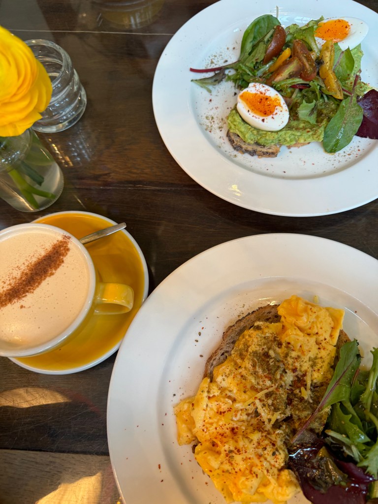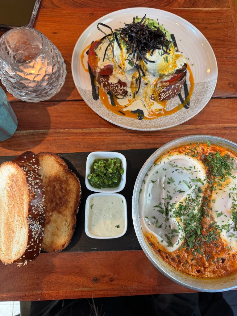 valentine’s day was a DAY. this was the only day we kiinnddaa got to sleep in but by that i mean we woke up after the sun rose… at 8am!!! and this day… this day introduced me to a true love in my life. shakshuka. i love valentine’s day so much and this was the best possible breakfast i could ever have. we headed over for florentin brunch and they were BUSY; but they were able to get us sat pretty damn quickly they just wanted us out in an hour. i ordered the orange juice and typically i would say i’m a pretty big pulp fan but what i didn’t expect was for the orange juice to be 97% pulp and 3% juice, stilll.. it was good. and obviously i’m a three bev kinda girl so i had a water, oj, AND a chai latte. then came the star. shakshuka. a bed of spicy bell pepper tomato sauce accompanied with 2 poached eggs (i kinda just want the yolks next time), and the BEST challah bread i’ve ever had the luxury of tasting. never in my life would i expect myself to enjoy a dish like this but it was so beautiful i went to bed thinking about it. and if you’ve been around me since february chances are i’ve told you about shakshuka and my love for it. also if you haven’t noticed i don’t really remember what azul ate 100% of the time, but if i do it’s typically in these linked instagram posts. sorry azul.